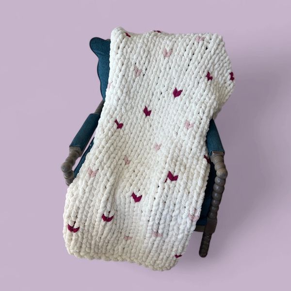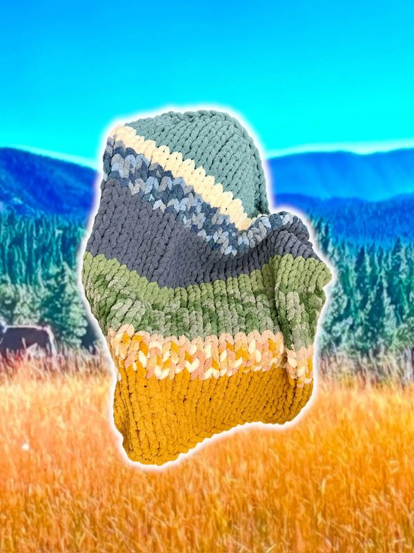 Carrie loves adding a level of art to her blankets with her idea of turning a stunning sunset or scenic view into a unique blanket! Here you'll find The Original Sunset and Scenic Chunky Knit Blankets. Every blanket is made by Carrie, by hand. She uses a finger-knitting method where no tools are used. The yarn is a jumbo size, 100% polye